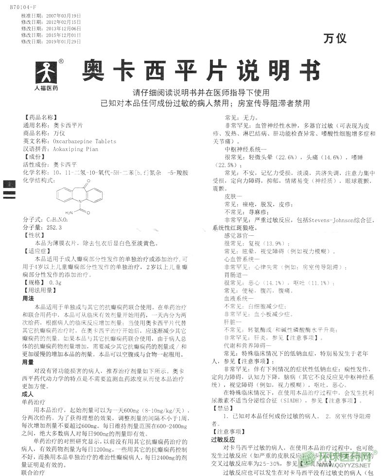 人福藥業(yè)萬(wàn)儀奧卡西平片說(shuō)明書(shū)圖片版(2019年版)
