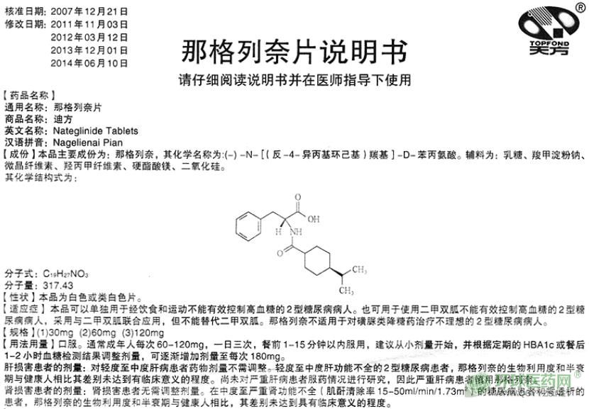 本品主要成份為:那格列奈,其化學(xué)名稱(chēng)為: (-)-N-[(反-4-異丙基環(huán)己基)羰基]-D-苯丙氨酸。輔料為:乳糖、羧甲淀粉鈉、微晶纖維素、羥丙甲纖維素、硬脂酸鎂、二氧化硅。