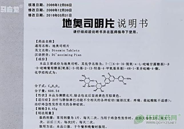 本品主要成份為地奧司明,其化學(xué)名稱(chēng)為:7-[[-6-O-(6-脫氧-α-L-吡喃甘露糖基)-β-D-吡喃(型)葡萄糖基]氧]-5-羥基-2-(3-羥基-4-甲基苯基)-4H-1-苯并吡喃-4-酮。