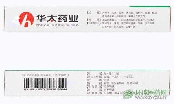 【主要成分】大青葉、大黃、石膏、薄荷腦、輔料為:淀粉、滑石粉、蔗糖、硬脂酸鎂等。