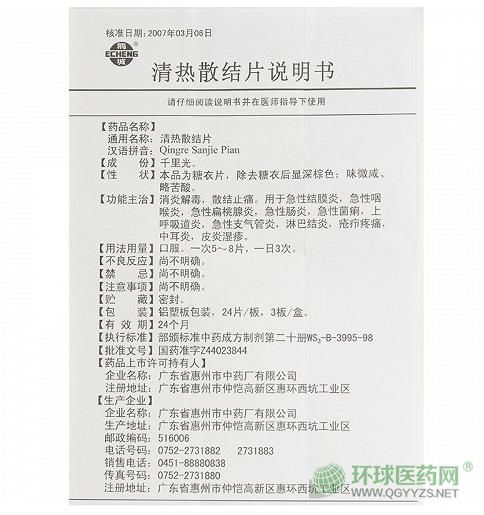 【功能主治】 清熱解毒,散結止痛。用于急性結膜炎,急性咽喉炎,急性扁桃腺炎,急性腸炎,急性菌痢,上呼吸道炎,急性支氣管炎,淋巴結炎,瘡癤疼痛,中耳炎,皮炎濕疹。
