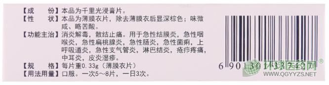 【功能主治】 消炎解毒,散結(jié)止痛。用于急性結(jié)膜炎,急性咽喉炎。急性扁桃腺炎,急性腸炎,急性菌痢,上呼吸道炎,急性支氣管炎,淋巴結(jié)炎,瘡癤疼痛,中耳炎,皮炎濕疹。