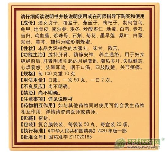 【成份】酒女貞子、覆盆子、菟絲子、枸杞子、制何首烏、龜甲、地骨皮、南沙參、麥冬、炒酸棗仁、地黃、白芍、赤芍、當歸、雞血藤、珍珠母、石斛、菊花、墨旱蓮、桑葉、白薇、知母、黃芩。輔料為賦形劑蜂蜜。