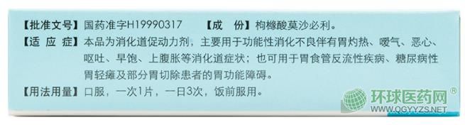 本品為消化道促動(dòng)力劑,主要用于功能性消化不良伴有胃灼熱、噯氣、惡心、嘔吐、早飽、上腹?jié)q等消化道癥狀;也可用于胃食管反流性疾病、糖尿病性胃輕癱及部分胃切除患者的胃功能障礙。