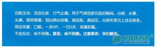 【功能主治】活血化瘀,行氣止痛。用于氣滯血瘀引起的胸悶、心悸、頭暈、頭痛、頸項(xiàng)疼痛; 冠心病心絞痛、高血脂、高血壓、心律失常見(jiàn)上述證候者。