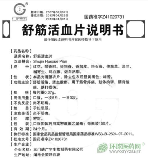 廣宇制藥舒筋活血片說明書文字版