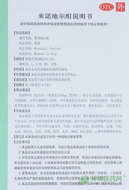 【注意事項(xiàng)】 1、蔓迪米諾地爾酊僅限于頭皮局部使用,不能口服或?qū)⒙厦字Z地爾酊用于身體的其他區(qū)域。 2、蔓迪米諾地爾酊對(duì)皮有瘢痕或損傷的部位無效。 3、蔓迪米諾地爾酊不可過量使用,如使用過量或發(fā)生嚴(yán)重良反應(yīng)時(shí)立即就醫(yī)。 4、使用蔓迪米諾地爾酊時(shí),應(yīng)注意觀察由米諾地爾引起的全身作用的一些征兆。一旦發(fā)生全身作用或嚴(yán)重的皮膚病反應(yīng),患者應(yīng)停止使用蔓迪米諾地爾酊,并與醫(yī)生聯(lián)系。 5、蔓迪米諾地爾酊可能會(huì)灼傷和刺激眼部。如發(fā)生藥液接觸敏感表面(眼,擦傷的部位,黏膜)時(shí),應(yīng)當(dāng)用大量的冷水沖洗該區(qū)域。 6、兒童、孕婦、哺乳期婦女及65歲以上老年人慎用蔓迪米諾地爾酊,若需使用時(shí)應(yīng)咨詢醫(yī)師或藥師。 7、盡管沒有證據(jù)顯示外用蔓迪米諾地爾酊可導(dǎo)致全身作用,但部分米諾地爾會(huì)被皮膚吸收,并可能存在心動(dòng)過速,心絞痛或增加由胍乙啶引起的直立性低血壓。所以原有心臟病病史的患者應(yīng)當(dāng)意識(shí)到使用蔓迪米諾地爾酊可能使病情惡化。 8、對(duì)蔓迪米諾地爾酊過敏者禁用,過敏體質(zhì)者慎用。 9、蔓迪米諾地爾酊性狀發(fā)生改變時(shí)禁止使用。 10、請(qǐng)將蔓迪米諾地爾酊放在兒童不能接觸的地方。 11、兒童必須在成人監(jiān)護(hù)下使用。 12、如正在使用其他藥品,使用蔓迪米諾地爾酊前請(qǐng)咨詢醫(yī)師或藥師。