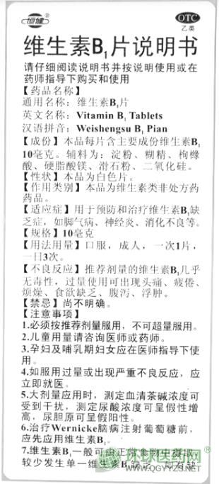 【成份】本品每片含主要成份維生素B110毫克。輔料為:淀粉、糊精、枸櫞酸、硬脂酸鎂、滑石粉、二氧化硅。