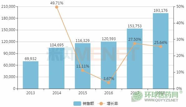 米內(nèi)網(wǎng)數(shù)據(jù)顯示,近幾年來,利奈唑胺在中國城市公立醫(yī)院、縣級公立醫(yī)院、城市社區(qū)中心以及鄉(xiāng)鎮(zhèn)衛(wèi)生院(簡稱中國公立醫(yī)療機(jī)構(gòu))終端的銷售額逐年上漲,2018年實(shí)現(xiàn)銷售收入19.32億元,同比增長25.64%,其中利奈唑胺葡萄糖注射液占據(jù)78.41%的市場份額。