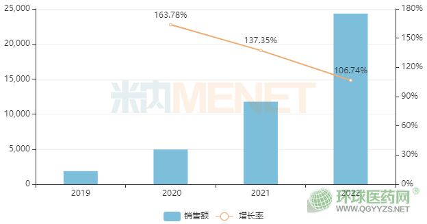 米內(nèi)網(wǎng)數(shù)據(jù)顯示,2020-2023年沙格列汀二甲雙胍緩釋片在中國(guó)三大終端六大市場(chǎng)的銷售額增速分別為163.78%、137.35%、106.74%,均達(dá)三位數(shù)。2022年銷售額銷售額約為2.27億元,其中城市公立醫(yī)院和縣級(jí)公立醫(yī)院銷售額為16485萬元,城市社區(qū)中心和鄉(xiāng)鎮(zhèn)衛(wèi)生院銷售額為2908萬元,城市實(shí)體藥店和網(wǎng)上藥店銷售額為3287萬元。