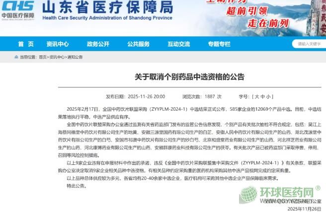 11月26日,山東省醫(yī)保局也發(fā)布公告,取消多家企業(yè)集采資格,涉及中藥飲片產品質量與生產狀態(tài)問題: