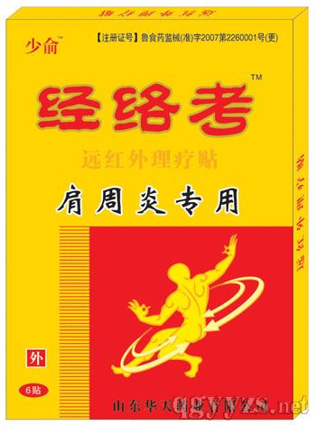 - 經(jīng)絡(luò)考遠(yuǎn)紅外理療貼--肩周炎專(zhuān)用 批準(zhǔn)文號(hào): 魯食藥監(jiān)械準(zhǔn)字2007第220012規(guī) 格: 3貼/袋×2袋/盒×400箱/箱