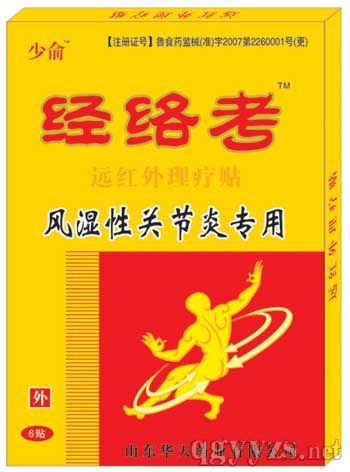 - 經(jīng)絡(luò)考遠(yuǎn)紅外理療貼--風(fēng)濕性關(guān)節(jié)炎專(zhuān)用 批準(zhǔn)文號(hào): 魯食藥監(jiān)械(準(zhǔn))字2007第220012規(guī) 格: 3貼/袋×2袋/盒×400箱/箱