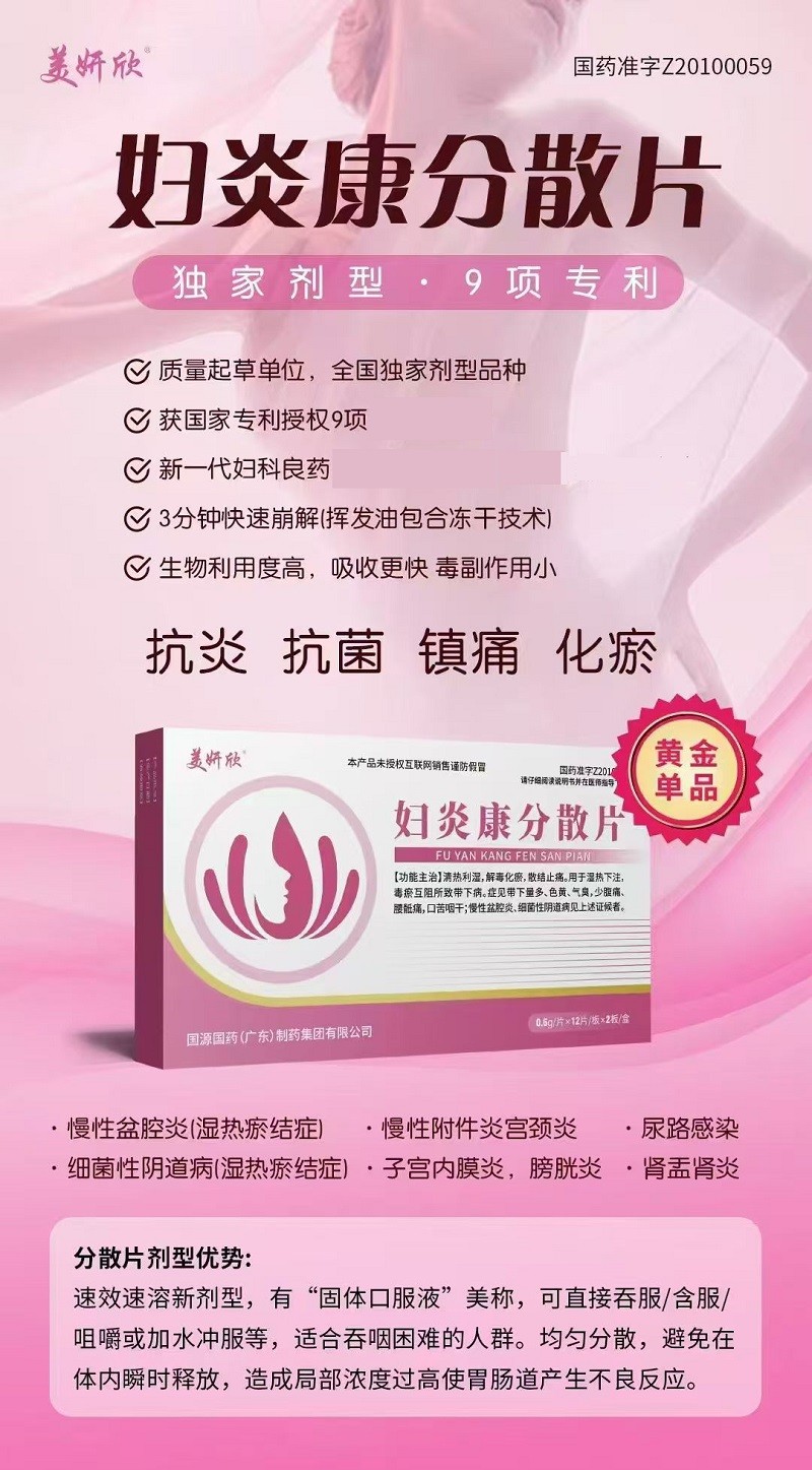 功能主治:清熱利濕,解毒化瘀,散結(jié)止痛。用于濕熱下注,毒瘀互阻所致帶下病。癥見帶下量多、色黃、氣臭,少腹痛、腰骶痛,口苦咽干;慢性盆腔炎、細(xì)菌性陰道病見上述證候者。