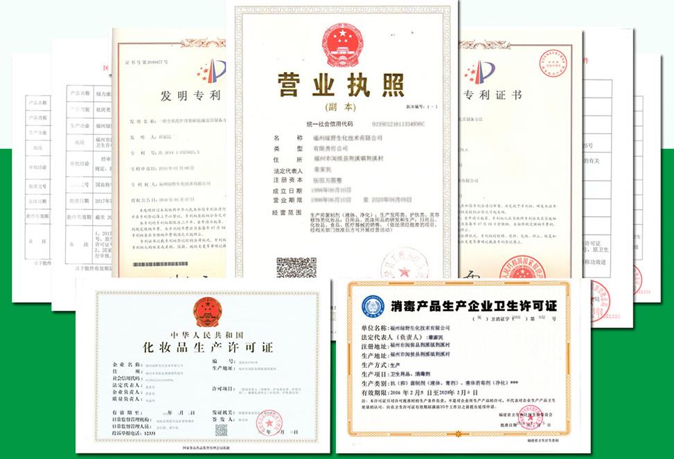 我們的產品多種多樣,包括但不限于醫(yī)用凝膠、消毒液、抑菌洗液等等,公司擁有“綠力”“綠力康膚”“威爾圣”“奧玫亭”“小兔哥”“雪莉”等多個品牌。公司自主研發(fā)的“綠力美白祛斑霜”、“綠力腋立爽”、“綠力豐韻美乳霜”,是獲國家藥監(jiān)局批準“國妝特字號”產品。可以滿足不同代理商的需求。(下圖為企業(yè)資質)