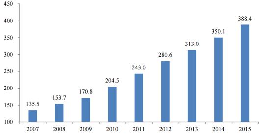 據(jù)統(tǒng)計(jì),我國(guó)的婦科疾病患病率為40%,患病人數(shù)近2.8億人(來(lái)自WHO公布數(shù)據(jù))。龐大的患者數(shù)量也讓婦科用藥市場(chǎng)越來(lái)越繁榮,2007 年中國(guó)婦科用藥市場(chǎng)規(guī)模為 135.5 億元,到 2015 年達(dá)到 388.4 億元,年復(fù)合增長(zhǎng)率為 14.07%。