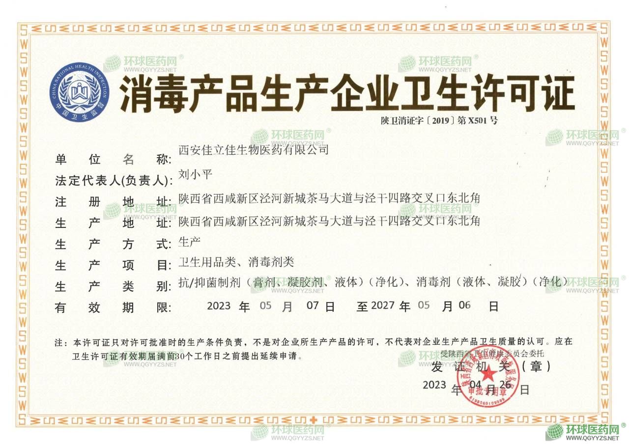 西安佳立佳生物醫(yī)藥有限公司坐落于美麗的千年古都——西安,是一家集科研、生產(chǎn)、銷售為一體的現(xiàn)代化高新技術(shù)企業(yè),生產(chǎn)基地位于西咸新區(qū)涇河新城美國科技產(chǎn)業(yè)園,占地面積二十余畝,建筑面積一萬多平方米,現(xiàn)有員工120余人,其中高級技術(shù)人員20人,產(chǎn)品覆蓋了醫(yī)療消毒用品,醫(yī)療清潔用品、抗抑菌制劑及個人用品等多個大類。