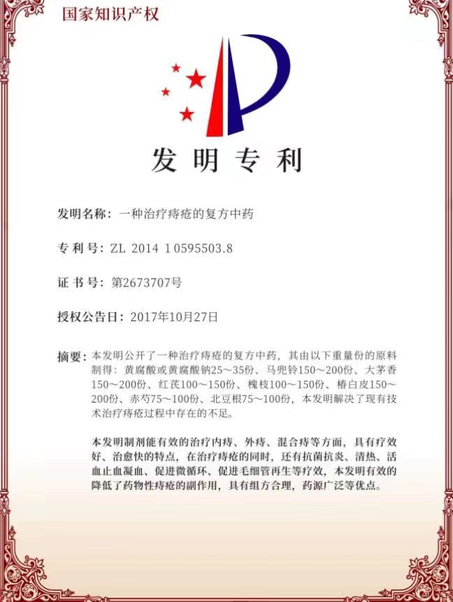 本發(fā)明制劑能有效的治療內(nèi)痔、外痔、混合痔等方面,具有療效好、**快的特點(diǎn),在治療痔瘡的同時(shí),還有抗菌抗炎、清熱、活血止血凝血、促進(jìn)微循環(huán)、促進(jìn)毛細(xì)管再生等療效,本發(fā)明有效的降低了藥物性痔瘡的副作用,具有組方合理,藥源廣泛等優(yōu)點(diǎn)。