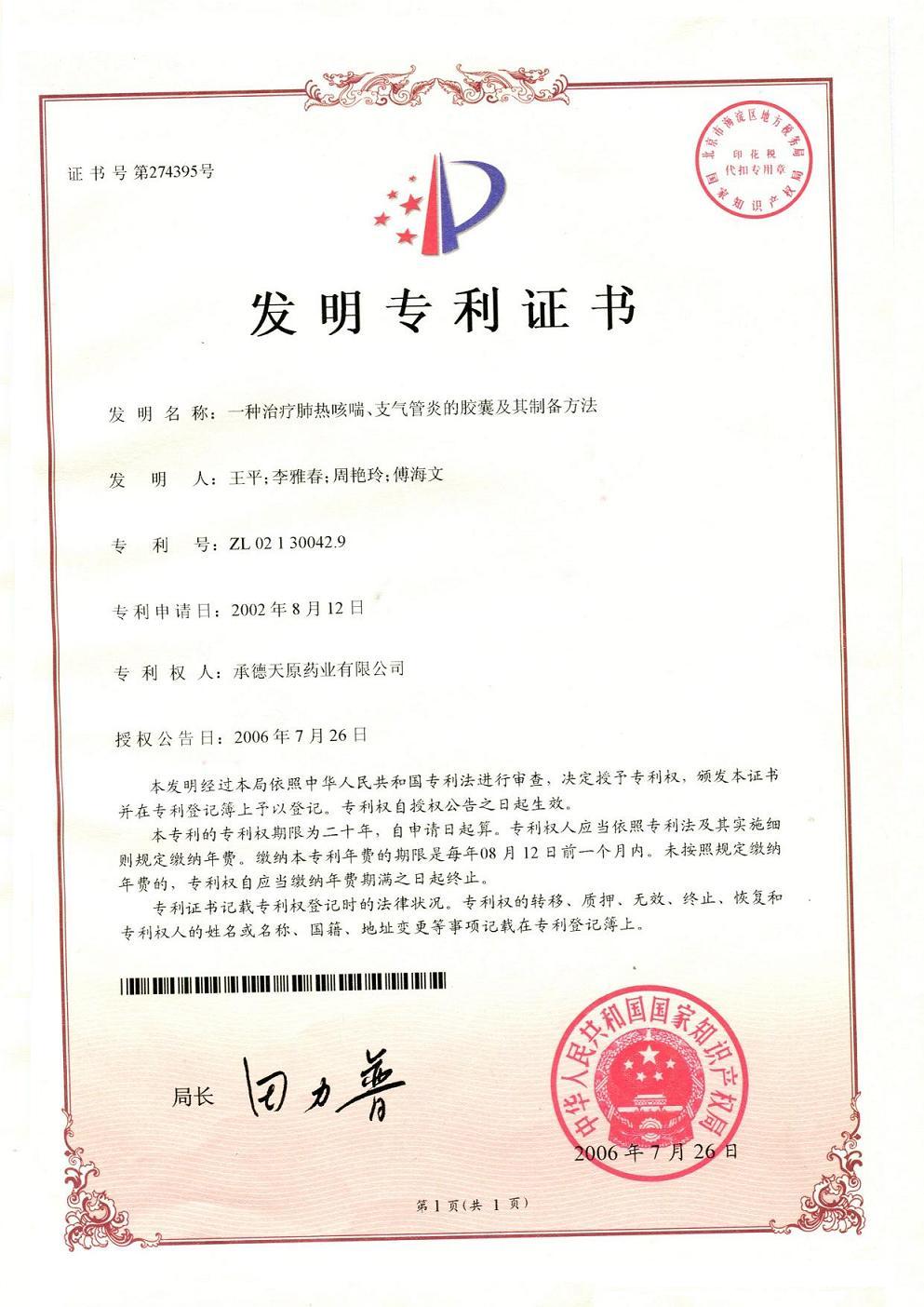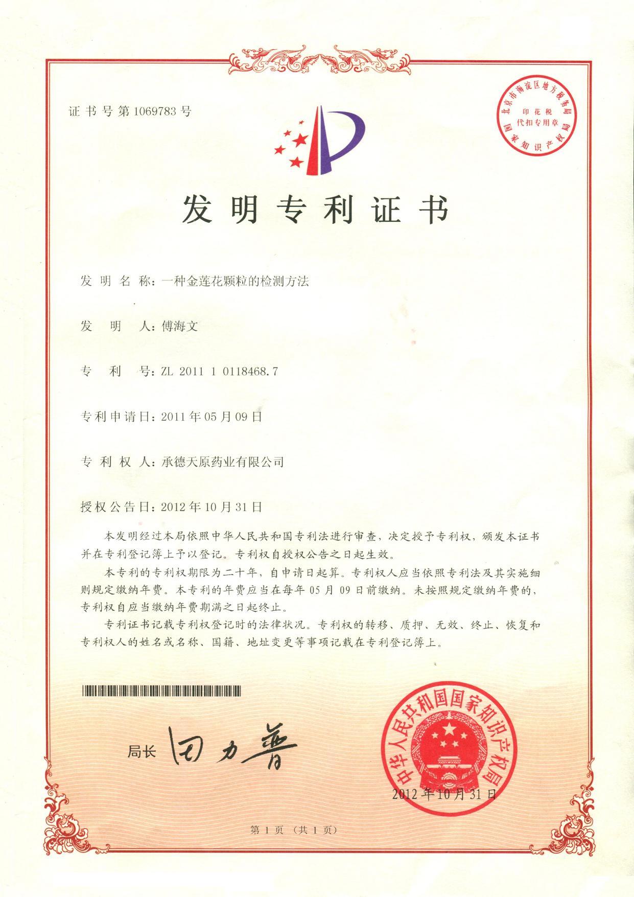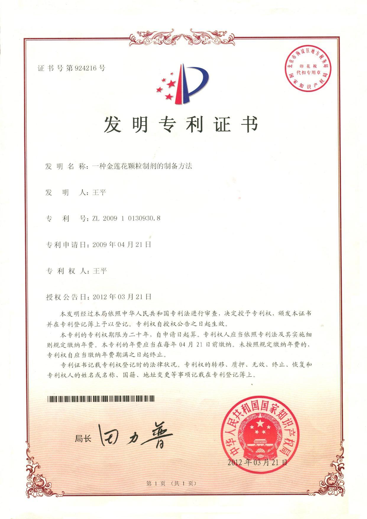 從原材料金蓮花的挑選檢測,到金蓮花的提取制備工藝,再到藥品的制備工藝,*后藥品成品的功效性能,這些全都有『專利證書』。!