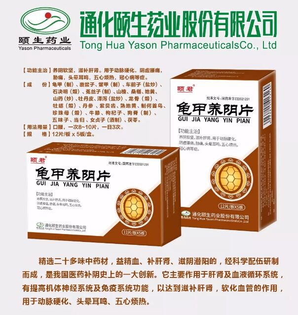 龜甲養(yǎng)陰片是根據(jù)“培補(bǔ)先天,滋水涵木”的理論,篩選二十多味益精血、補(bǔ)肝腎、滋陰潛陽(yáng)的中藥材,經(jīng)科學(xué)配伍研制而成。它主要作用于肝腎及血液循環(huán)系統(tǒng),有提高機(jī)體神經(jīng)系統(tǒng)及免疫系統(tǒng)功能,以達(dá)到滋補(bǔ)肝腎,軟化血管的作用。