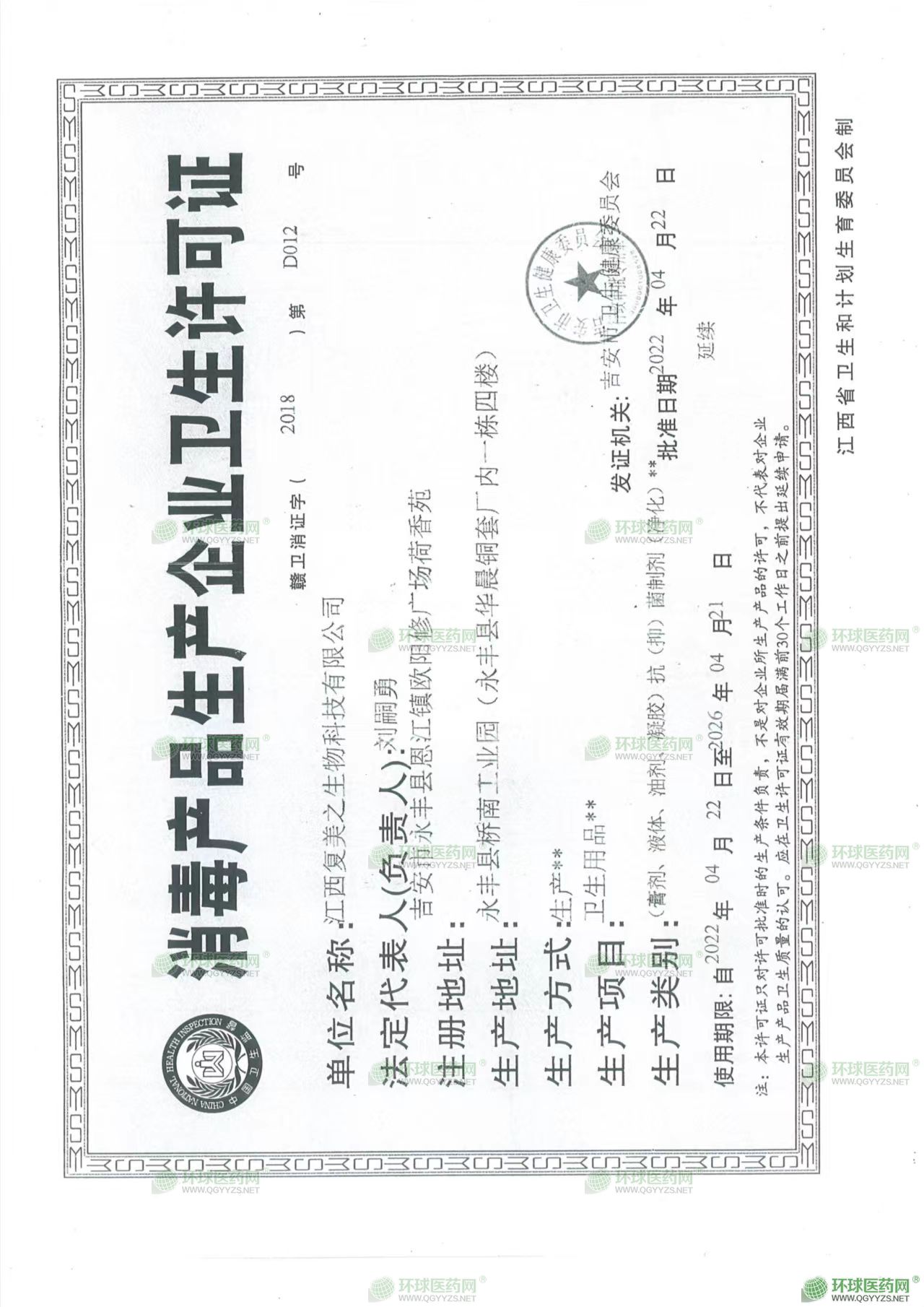 - 消毒產(chǎn)品生產(chǎn)企業(yè)衛(wèi)生許可證