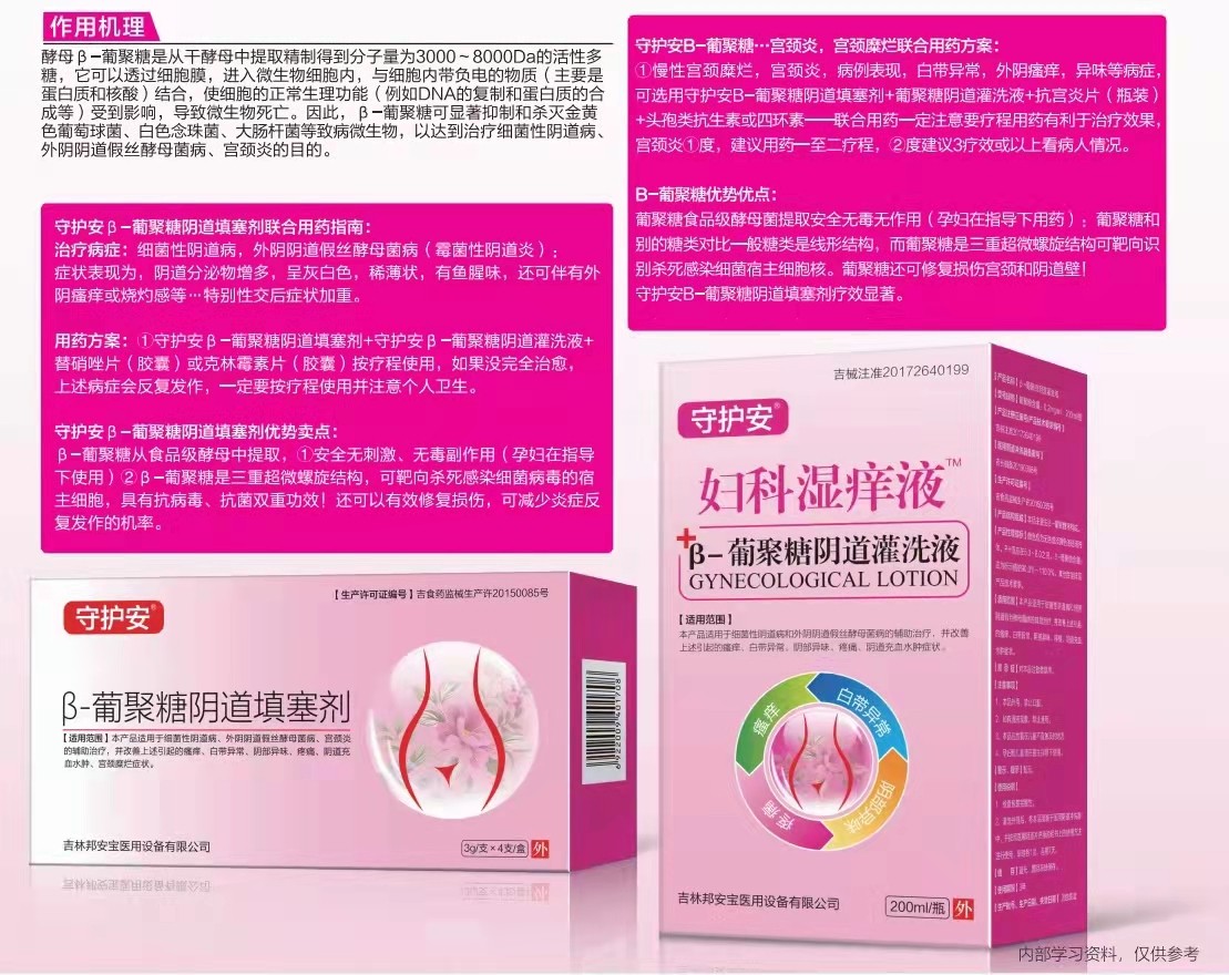 產(chǎn)品用途:適用于細菌性陰道炎、外陰陰道假絲酵母菌病、慢性宮頸糜爛,宮頸炎,病例表現(xiàn),白帶異常,外陰瘙癢,異味等病癥。葡聚糖還可以修護損傷宮頸和陰道壁。與守護安β=葡聚糖陰道填塞劑聯(lián)合用藥使用。