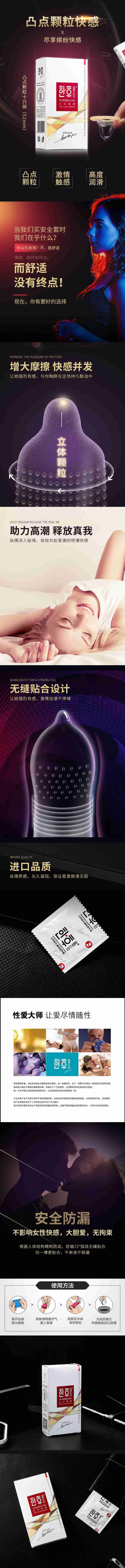 獨(dú)特: 韓后**套,特有男性快感增強(qiáng)性專利;盍Τ志眯。傳統(tǒng)與時(shí)尚結(jié)合,多種款式迎合不同消費(fèi)要求,特創(chuàng)造出光面、果味、持久、男性快感等多種傳統(tǒng)與時(shí)尚品味的**套。