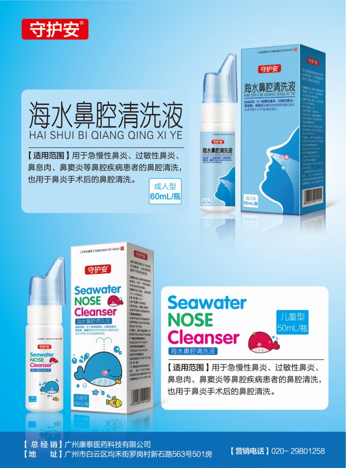 守護安海水鼻腔清洗液其作用原理表現(xiàn)為借用一定壓力(或吸、或用重力、或用機械壓力)將生理鹽水送入鼻孔,流經(jīng)鼻前庭(露在頭部外面的部分)、鼻竇、鼻道繞經(jīng)鼻咽部,或從一側(cè)鼻孔排出,或從口部排出。通過以上路徑,借助于水流的沖擊力,將鼻腔內(nèi)已聚集的致病及污洉排出,從而使鼻腔恢復(fù)正常的生理環(huán)境,恢復(fù)鼻腔的自我排毒功能,達到保護鼻腔的目的。