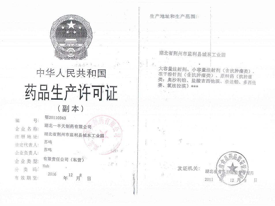 生產(chǎn)范圍: 1.湖北省荊州監(jiān)利市城東工業(yè)園凍干粉針劑(含抗腫瘤類)、小容量注射劑(含抗腫瘤類)、大容量注射劑(玻璃輸液瓶生產(chǎn)線)、原料藥(含抗腫瘤類)。***2.受托方:宜昌三峽制藥有限公司;生產(chǎn)地址:湖北省宜昌市東山經(jīng)濟開發(fā)區(qū)大連路;生產(chǎn)范圍:大容量注射劑。***3.受托方:武漢濱湖雙鶴藥業(yè)有限責(zé)任公司;生產(chǎn)地址:湖北省武漢市東湖新技術(shù)開發(fā)區(qū)左嶺工業(yè)園;生產(chǎn)范圍:大容量注射液。***4.受托方:武漢濱湖雙鶴藥業(yè)有限責(zé)任公司;生產(chǎn)地址:湖北省監(jiān)利縣城南工業(yè)園;生產(chǎn)范圍:大容量注射液。***5.受托方:武漢濱湖雙鶴藥業(yè)有限責(zé)任公司;生產(chǎn)地址:武漢市洪山區(qū)廣八路17號;生產(chǎn)范圍:小容量注射劑(含激素類)、滴眼劑、滴鼻劑。***