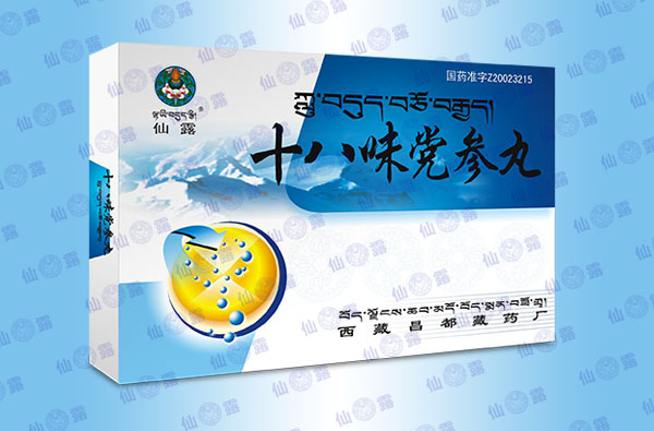 【主要成分】藏黨參、鐵棒錘、決明子、黃堇、渣馴膏、藏草蒲、寬筋藤、訶子(去核)、手參、毛訶子、乳香、麝香等十八味。