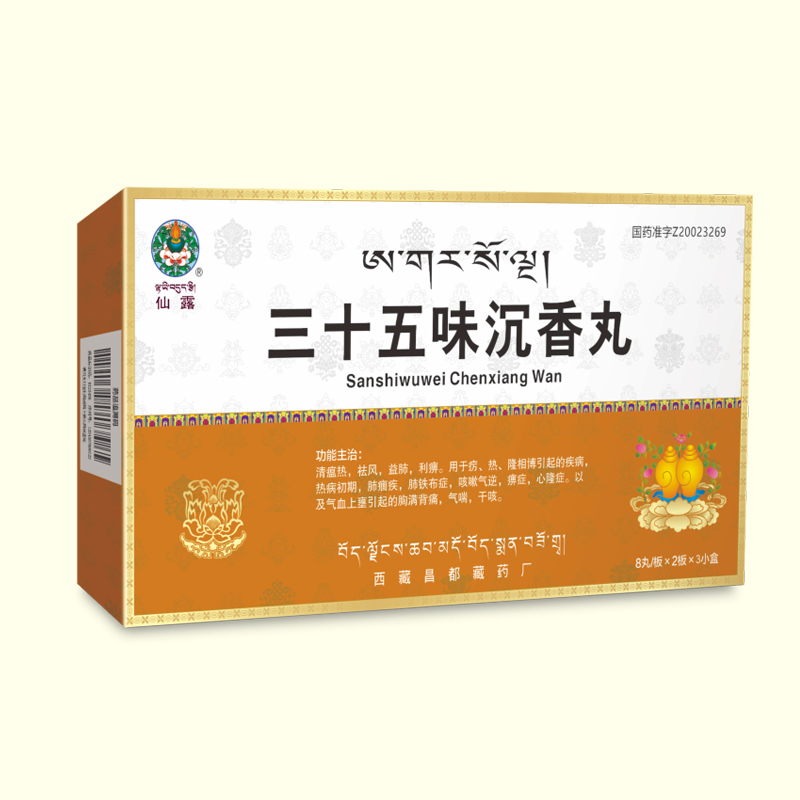 主要成分:沉香、香樟、白沉香、檀香、降香、天竺黃、紅花、丁香、肉豆蔻、豆蔻、草果、訶子(去核)、毛訶子(去核)、余甘子(去核)、木香、廣棗、藏木香、懸鉤木、寬筋藤、山奈、木棉花、馬錢子、乳香、安息香、巴夏嘎、小傘虎耳草、兔耳草、多刺綠絨蒿、打箭菊、矮垂頭菊、叢服、石榴子、鐵棒錘、野牛心、人工麝香。