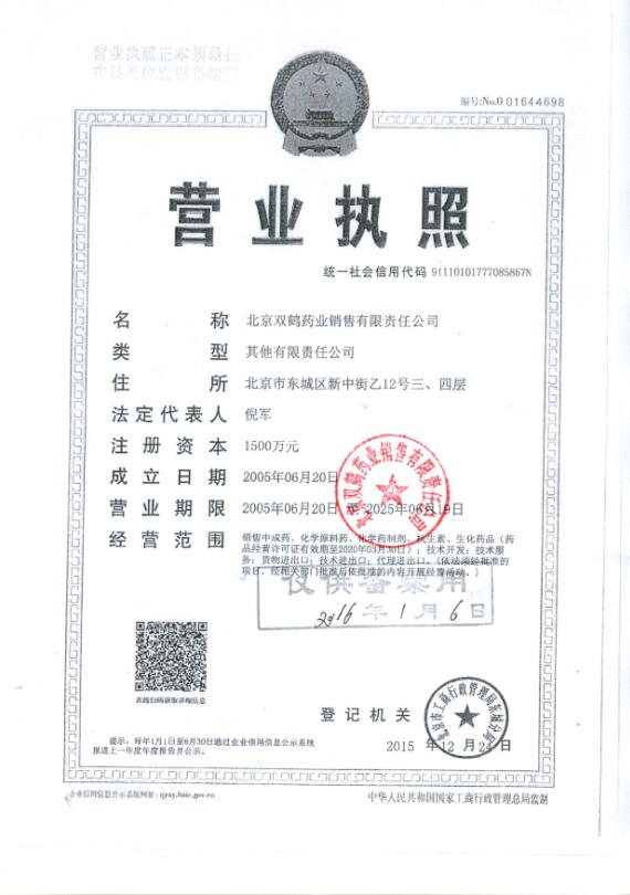 生產(chǎn)范圍: 大容量注射劑(含多層共擠輸液袋)、小容量注射劑(含抗腫瘤藥、最終滅菌、非最終滅菌)、凍干粉針劑(含青霉素類)、片劑(含頭孢菌素類)、硬膠囊劑、顆粒劑(含頭孢菌素類)、沖洗劑、軟膠囊劑、氣霧劑、凝膠劑、涂劑(外用)、進口藥品分包裝(硬膠囊劑)、生化原料藥、中藥提取、精神藥品***山西省運城市夏縣城北三里墩(山西晉新雙鶴藥業(yè)有限責任公司)片劑***南京高新開發(fā)區(qū)新科三路18號(南京海鯨藥業(yè)有限公司)片劑***河北省滄州臨港經(jīng)濟技術(shù)開發(fā)區(qū)西區(qū)華佗路3號原料藥、精神藥品***北京市門頭溝區(qū)石龍經(jīng)濟開發(fā)區(qū)上園路1號(北京萬輝雙鶴藥業(yè)有限責任公司)片劑、硬膠囊劑***鎮(zhèn)江新區(qū)機電工業(yè)園(江蘇海宏制藥有限公司)凍干粉針劑***山西省運城市夏縣城北三里墩(山西晉新雙鶴藥業(yè)有限責任公司)集團內(nèi)共用中藥前處理和中藥提取***北京市通州區(qū)中關(guān)村科技園光機電基地經(jīng)海七路3號(華潤賽科藥業(yè)有限責任公司 )片劑、硬膠囊劑***