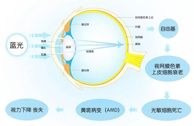 太陽光中的紫外線、電子產(chǎn)品使用不當釋放的高能量藍光等有害光,會穿透透明的角膜、晶狀體、玻璃體,直達黃斑,并與感光細胞發(fā)生光化學反應(yīng),形成自由基,進而對細胞產(chǎn)生破壞,引起黃斑氧化,帶來黃斑病變。
