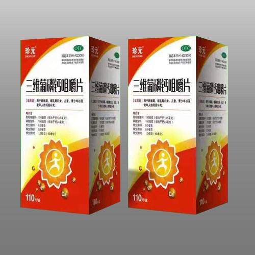 三維葡磷鈣咀嚼片為復方制劑,每片含葡萄糖酸鈣150毫克,(相當于鈣13.5毫克),磷酸氫鈣100毫克,(相當于鈣24毫克),維生素B1 0.5毫克,維生素B2 0.5毫克,維生素D21.5微克(60單位)。