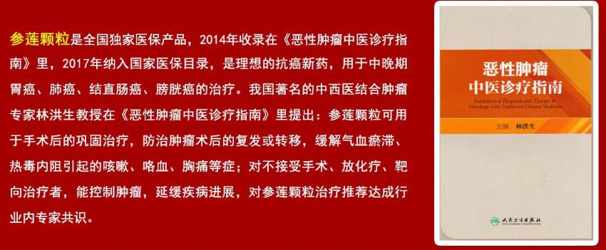參蓮顆粒為中藥制劑,具有扶正祛邪,活血化淤,止痛散結(jié),清熱解毒的功效,可用于肺癌、胃癌等祛邪而不傷正,可緩解病人癥狀,減輕化療中的不良反應(yīng),改善病人生存質(zhì)量,延長生存期。