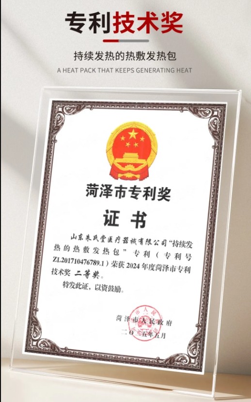 在科技創(chuàng)新的璀璨星空中,山東朱氏堂醫(yī)療器械有限公司憑借雄厚研發(fā)實力與不懈的創(chuàng)新追求,再次閃耀光芒!公司的“持續(xù)發(fā)熱的熱敷發(fā)熱包” 專利(專利號 ZL201710476789.1)在眾多項目中脫穎而出,榮獲 2024 年度菏澤市專利技術(shù)獎二等獎,這一榮譽不僅是對朱氏堂技術(shù)創(chuàng)新的高度認(rèn)可,更是其在醫(yī)療器械領(lǐng)域深耕細(xì)作、砥礪前行的有力見證。