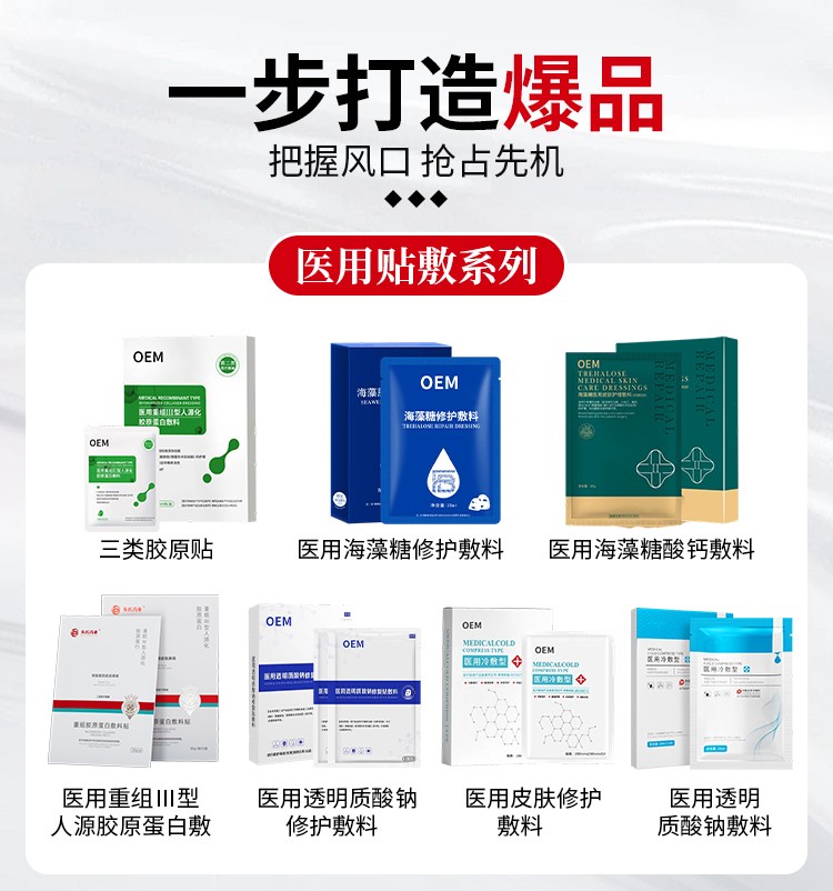 一、科學(xué)配方定制:以功效為核心,精準(zhǔn)匹配應(yīng)用場(chǎng)景山東皇圣堂藥業(yè)有限公司擁有獨(dú)立研發(fā)實(shí)驗(yàn)室與百人技術(shù)團(tuán)隊(duì),可根據(jù)品牌定位和目標(biāo)人群,定制具有明確修復(fù)功效的配方方案:術(shù)后修復(fù)類:采用高純度透明質(zhì)酸鈉、重組膠原蛋白、積雪草提取物等成分,優(yōu)化基質(zhì)滲透性,加速皮膚屏障重建;敏感肌護(hù)理類:通過(guò)低溫萃取工藝保留植物活性,減少刺激源,提升舒緩效果;專利技術(shù)支持:應(yīng)用微針透皮、納米緩釋等專利工藝,增強(qiáng)成分吸收率與產(chǎn)品穩(wěn)定性 。**配方均需通過(guò)細(xì)胞毒性試驗(yàn)、皮膚刺激性試驗(yàn)等**性驗(yàn)證,確保臨床使用**可靠 。二、多劑型靈活開發(fā):滿足不同護(hù)理場(chǎng)景需求支持多種劑型的個(gè)性化開發(fā),適配醫(yī)美機(jī)構(gòu)多樣化操作流程:貼膜類(水凝膠、無(wú)紡布、生物纖維)凝膠/乳液類(冷敷凝膠、修復(fù)精華)噴霧/敷料類(即用型噴霧、無(wú)菌紗布浸液)企業(yè)采用模塊化生產(chǎn)線,可快速切換不同劑型與規(guī)格,支持小批量試產(chǎn)(低至5000片起訂),降低品牌試錯(cuò)成本 。