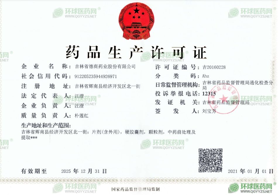 德商藥業(yè)生產(chǎn)制造部坐落于長(zhǎng)白山余脈龍崗山脈南側(cè),位于吉林省通化市輝南縣經(jīng)濟(jì)開(kāi)發(fā)區(qū)。占地6.3萬(wàn)平方米,擁有現(xiàn)代化中成藥和西藥生產(chǎn)線(xiàn)。工廠(chǎng)建有符合GMP要求的中藥前處理提取車(chē)間和口服固體制劑車(chē)間,針劑生產(chǎn)車(chē)間,配備了國(guó)際先進(jìn)的生產(chǎn)設(shè)備和優(yōu)秀的生產(chǎn)管理人員。工廠(chǎng)年產(chǎn)片劑2.5億片,膠囊劑2.5億粒,顆粒劑2000萬(wàn)袋。