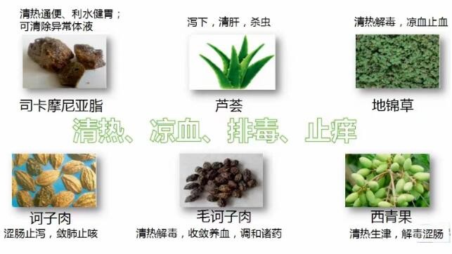 主要成分:地錦草、訶子(肉)、毛訶子(肉)、司卡摩尼亞脂、蘆薈、西青果。