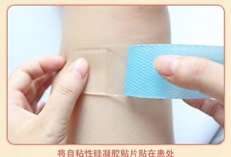 2、請打開包裝袋,取出疤痕貼,撕去貼面上的一層透明隔離紙,將粘性一面與疤痕緊密貼合,排空空氣;