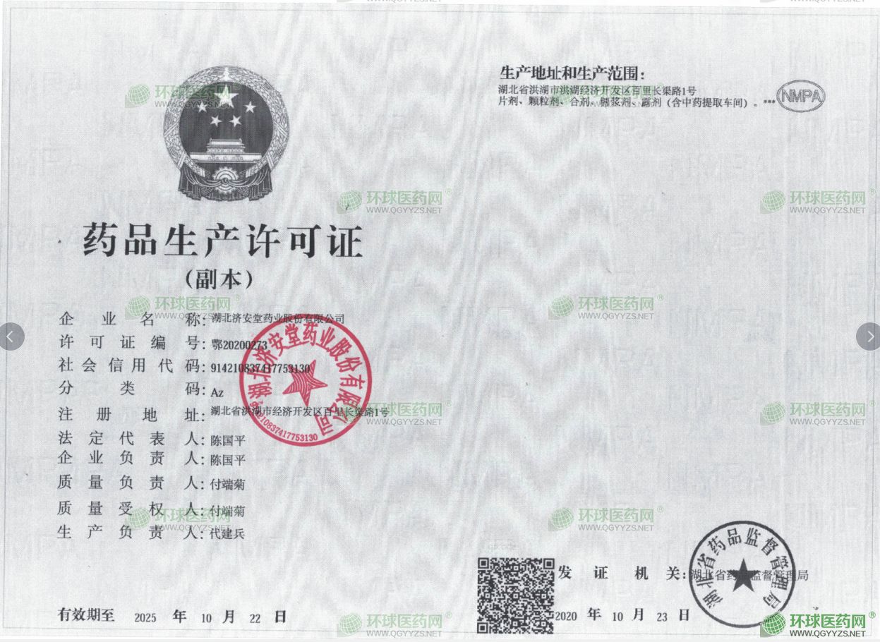 發(fā)證機關: 湖北省藥品監(jiān)督管理局
