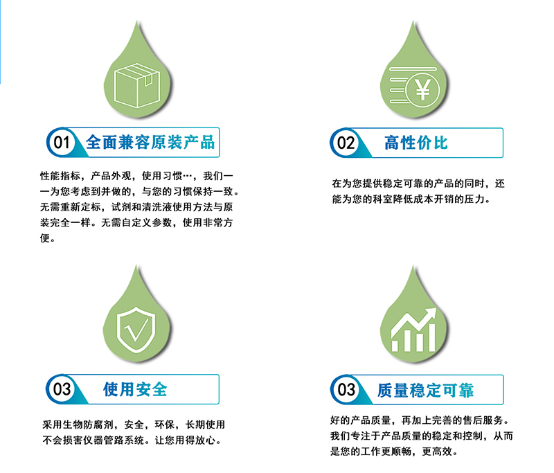 1、**兼容原裝產(chǎn)品:性能指標(biāo),產(chǎn)品外觀,使用習(xí)慣,我們一一為您考慮到并做的,與您的習(xí)慣保持一致 。無(wú)需重新定標(biāo),試劑和清洗液使用方法與原裝完全一樣。無(wú)需自定義參數(shù),使用非常方便。