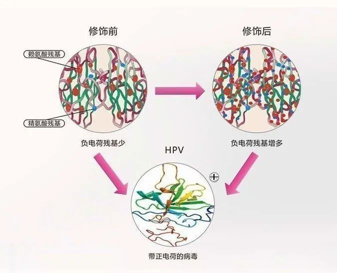 生物蛋白來源于牛奶中的乳鐵蛋白,而該蛋白上含有690多個殘基。未經(jīng)修飾的乳鐵蛋白即可感染部分病毒與宿主細(xì)胞的結(jié)合,并且抑制其感染性炎癥的發(fā)生,通過科技手段進(jìn)行酸酐化生物蛋白為酸酐修飾的蛋白,使其有著極高的修飾率。經(jīng)過修飾獲得的生物蛋白表面滿載負(fù)電荷,與HPV病毒相結(jié)合,表現(xiàn)出優(yōu)秀的活性。