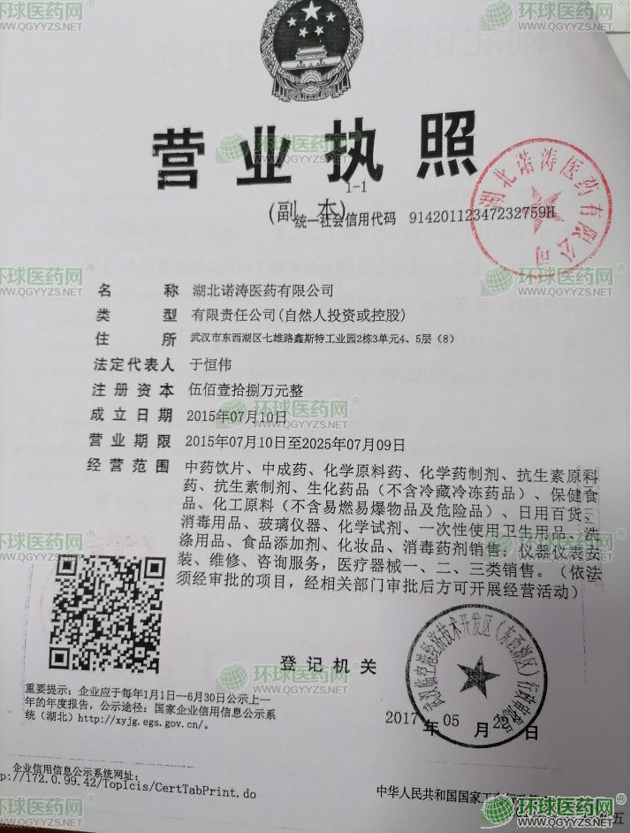 湖北諾濤醫(yī)藥有限公司成立于2015年7月10日,注冊資金518萬元人民幣,地址位于武漢市東西湖區(qū)七雄路鑫斯特工業(yè)園,經(jīng)營范圍:中藥飲片、中成藥、化學(xué)原料藥、化學(xué)藥制劑、抗生素原料藥、抗生素制劑、生化藥品(不含冷藏冷凍藥品)、保健食品、化工原料(不含易燃易爆物品及危險(xiǎn)品)、日用百貨、消毒用品、玻璃儀器、化學(xué)試劑、一次性使用衛(wèi)生用品、洗滌用品、食品添加劑、化妝品、消毒藥劑銷售;儀器儀表安裝、維修、咨詢服務(wù),醫(yī)療器械一、二、三類銷售。(依法須經(jīng)審批的項(xiàng)目,經(jīng)相關(guān)部門審批后方可開展經(jīng)營活動(dòng))