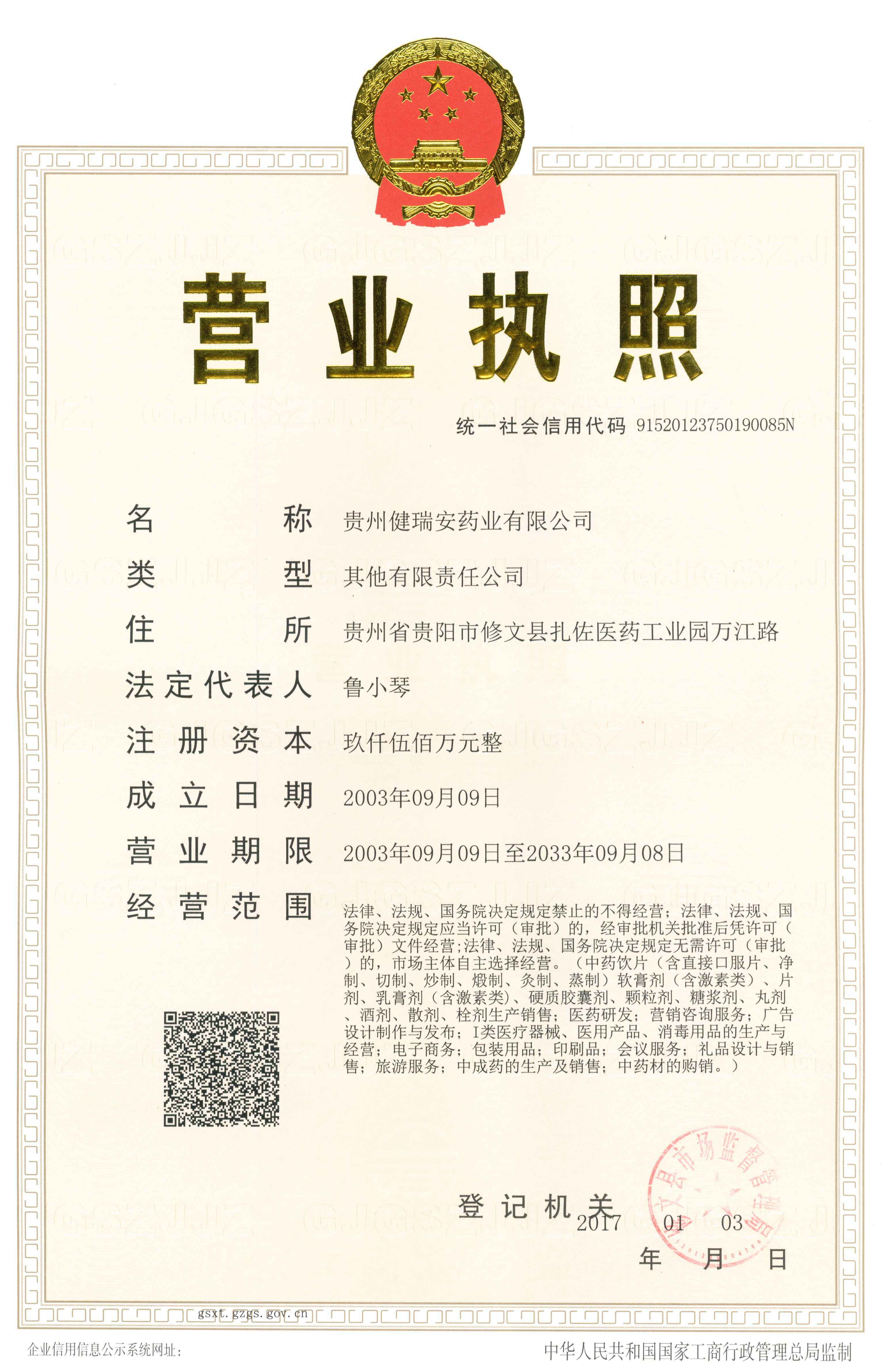 貴州健瑞安藥業(yè)有限公司是由海南伊順藥業(yè)有限公司于2016年5月通過全資收購原“貴陽大漢制藥有限公司”而成立的一家集中醫(yī)藥技術研發(fā)、生產(chǎn)、銷售于一體的高科技藥品生產(chǎn)企業(yè)。健瑞安公司位于貴陽市修文縣扎佐醫(yī)藥工業(yè)園萬江路,占地面積46005平方米,一期建筑面積為3萬平方米。其中綠化面積占總面積的50%,注冊資金9500萬元,主營:藥品、中藥提取物、保健食品、天然化妝品、醫(yī)療用品的開發(fā)、生產(chǎn)及銷售,年產(chǎn)值5億元。