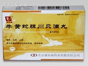 - 牛黃蛇膽川貝滴丸 批準(zhǔn)文號: 國藥準(zhǔn)字Z10980040規(guī) 格: 每丸重35毫克,每盒60丸。