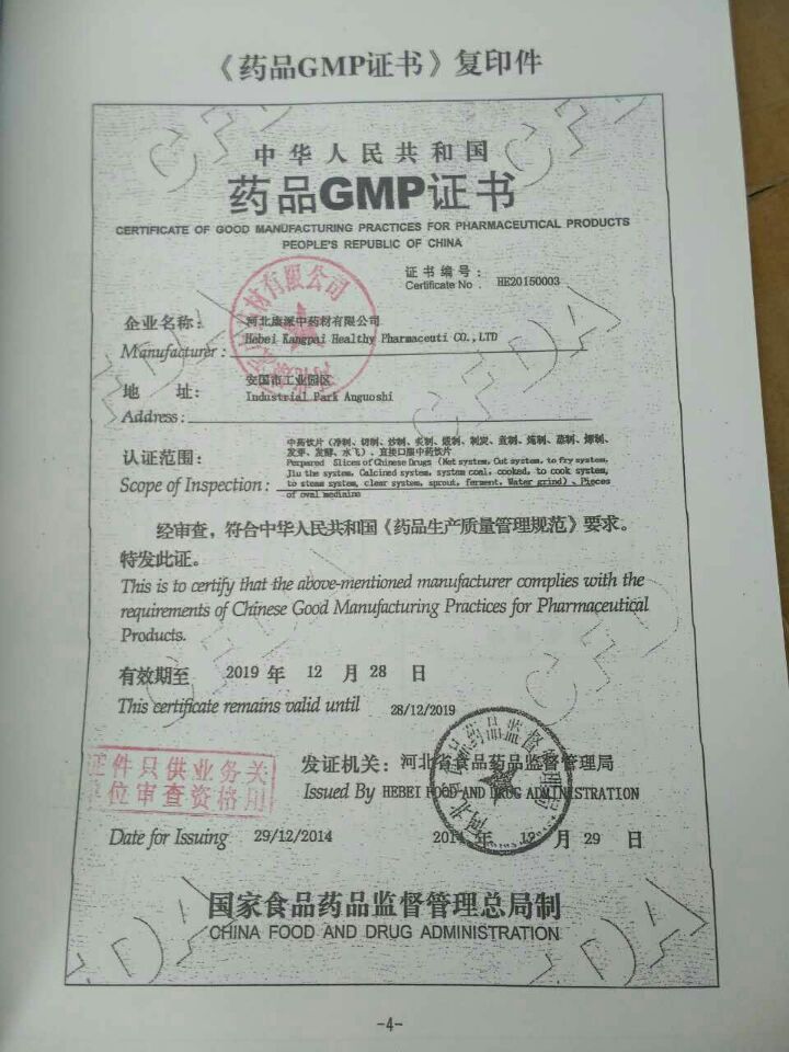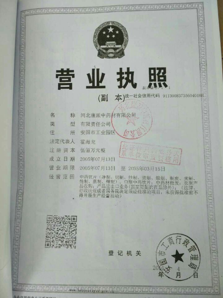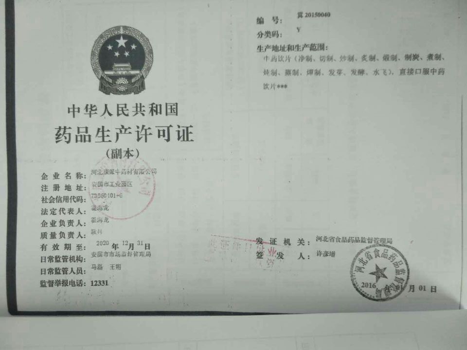 河北康派中藥材有限公司始建于2005年,坐落在安國市工業(yè)城園區(qū)保衡路東側。按照GMP標準設計建設,公司占地近20畝,建筑面積8800余平米,注冊資金500萬元。公司經營范圍為中藥飲片、口服中藥飲片、農副產品收購,主營業(yè)務為中藥飲片生產,是集現(xiàn)代化中藥飲片生產、經營、銷售為一體的民營企業(yè)。公司現(xiàn)有職工86人,中級職稱技術人員16名,初級以上職稱20人。占職工人數(shù)42%。