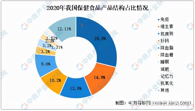 2016年7月1日起,《保健食品注冊與備案管理辦法》正式開始實施,保健食品行業(yè)正式步入“注冊制”與“備案制”雙軌并行時代。截至2020年2月底,我國保健食品批文總數(shù)達(dá)到16535個,其中國產(chǎn)保健食品滋補品為15752個,進(jìn)口保健食品滋補品為783個。目前我國市面上比較熱門的保健食品保健功能主要集中在調(diào)節(jié)免疫,占28.8%。其次為維生素(14.9%)、抗疲勞(12.9%)及補鈣(10.2%)等。(此數(shù)據(jù)來源于知乎)