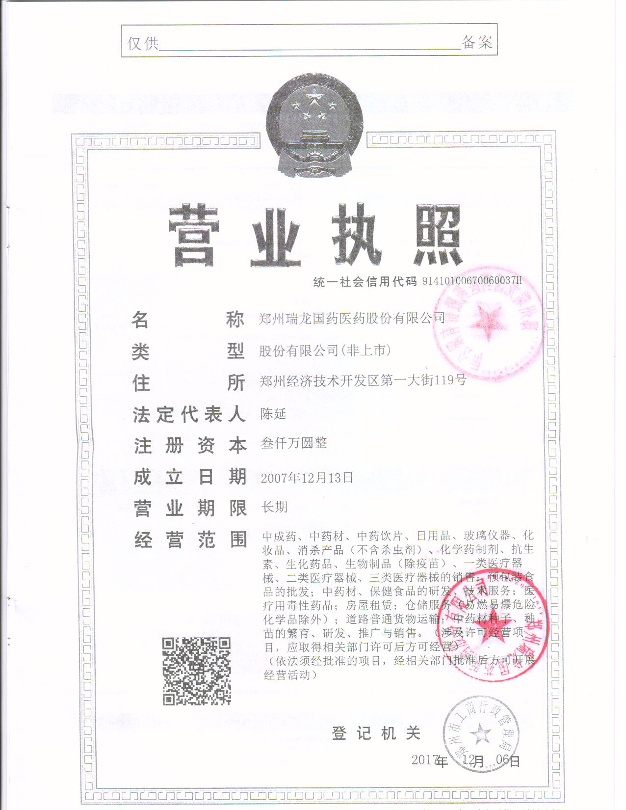 鄭州瑞龍國藥醫(yī)藥股份有限公司是以中藥飲片為特色,飲片業(yè)務(wù)在河南省規(guī)模大、品規(guī)全、團隊專業(yè)的一家醫(yī)藥商業(yè)公司。注冊資金:3000萬元。地址:鄭州市經(jīng)濟技術(shù)開發(fā)區(qū)大街119號。主要經(jīng)營:中成藥、中藥材、中藥飲片、日用品、玻璃儀器、化妝品、消殺產(chǎn)品(不含殺蟲劑)、化學(xué)藥制劑、抗生素、生化藥品、生物制品(除疫苗)、一類醫(yī)療器械、二類醫(yī)療器械、三類醫(yī)療器械的銷售;預(yù)包裝食品的批發(fā);中藥材、保健食品的研發(fā)、技術(shù)服務(wù);醫(yī)療用毒性藥品;房屋租賃;倉儲服務(wù)(易燃易爆危險化學(xué)品除外);道路普通貨物運輸;中藥材種子種苗的繁育、研發(fā)、推廣與銷售。