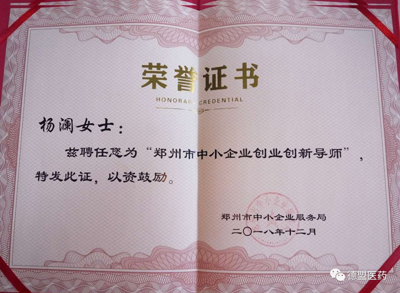 德盟醫(yī)藥銷售總監(jiān)楊瀾被鄭州市中小企業(yè)服務(wù)局評(píng)為鄭州市中小企業(yè)創(chuàng)業(yè)創(chuàng)新導(dǎo)師!